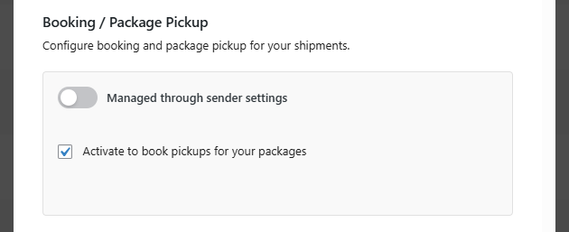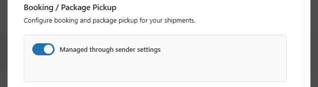 - Managed through sender settings – If enabled, booking and package pickup settings from the global sender configuration will be used. (See Sender configuration for more details.)