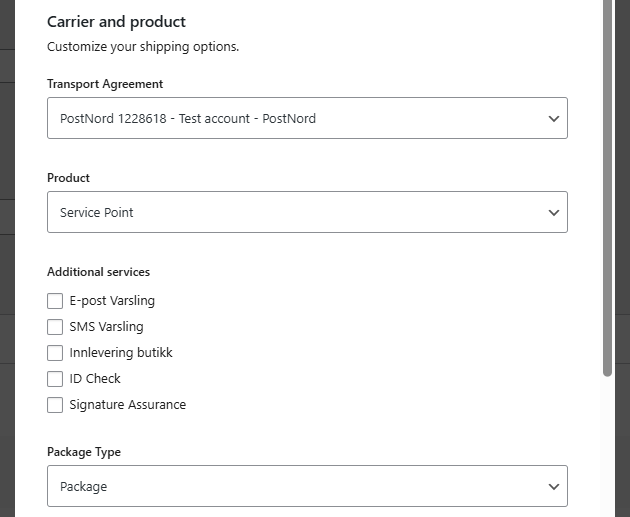 - Name – Enter a name for the shipping method. We recommend using a name that matches the service you will connect in Transport Agreement below.