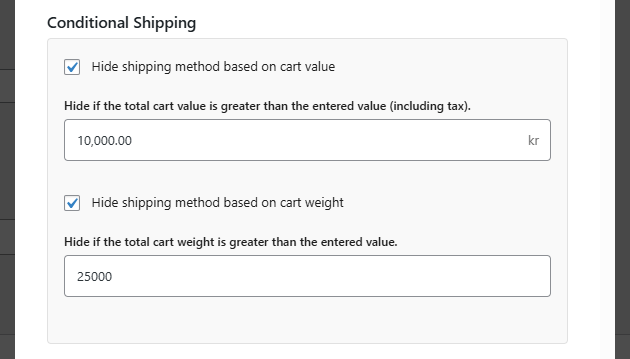 Hide if the total cart value is greater than the entered value (including tax). - Hide shipping method based on cart weight – Enable this option to hide the shipping method when the total cart weight exceeds a specified limit.