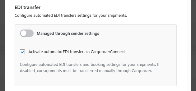 - Managed through sender settings – If enabled, EDI transfer settings from the global sender configuration will be used. (See Sender configuration for more details.)