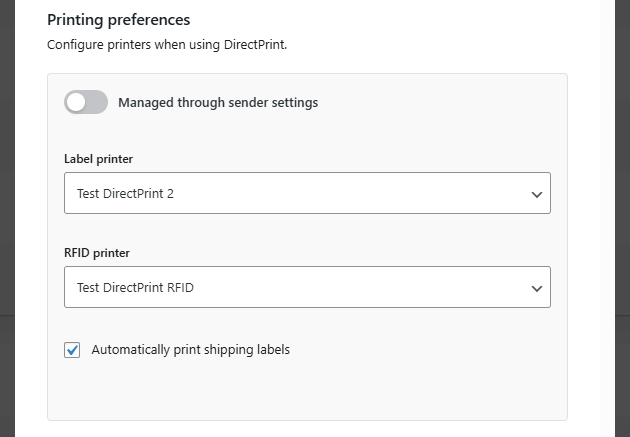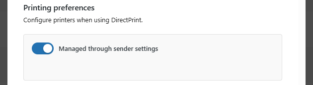 - Managed through sender settings – If enabled, printer settings from the global sender configuration will be used. (See Sender configuration for more details.)