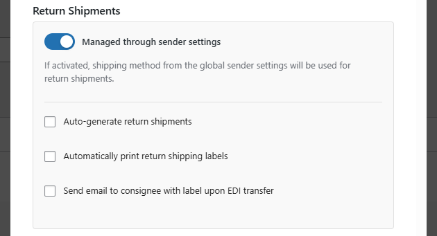 - Managed through sender settings – If enabled, the return shipping configuration defined in the global sender settings will be used. (See Sender configuration for more details.)