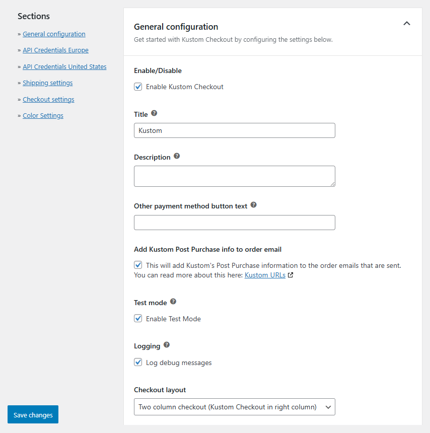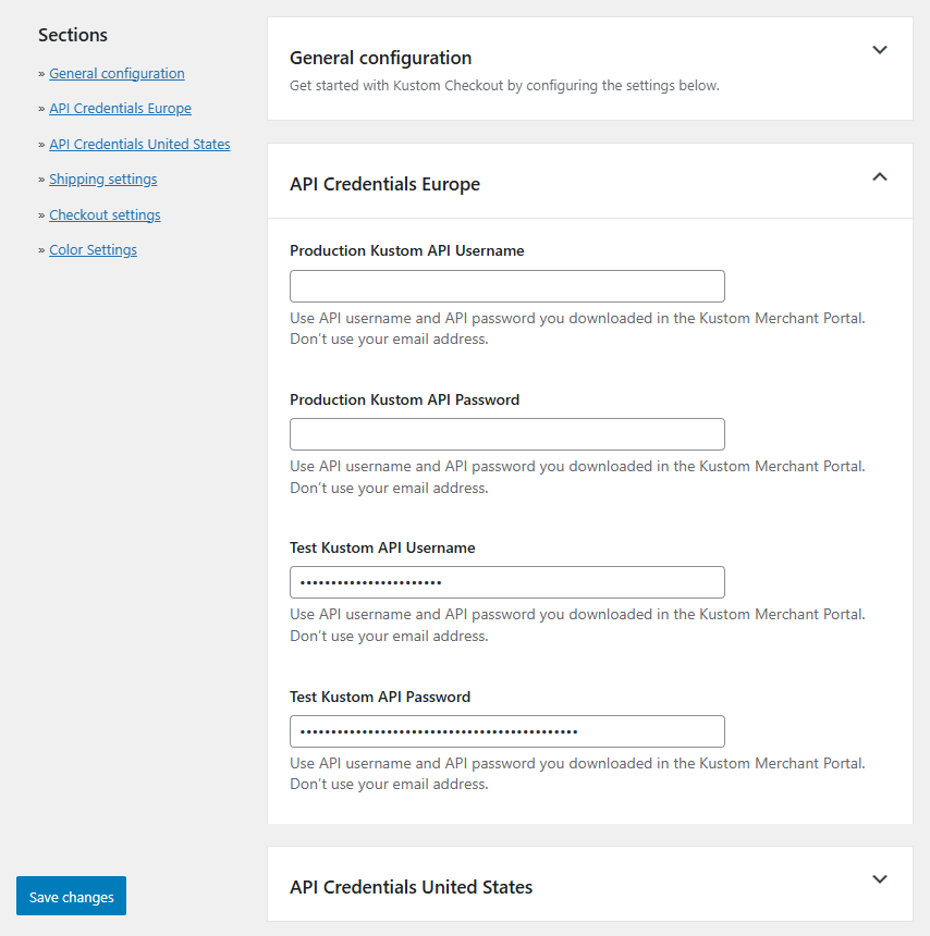 Enter the API Credentials Europe or United States, depending on your store’s base location and the countries you sell to. This will enable Kustom Checkout as an available payment method for the selected region.