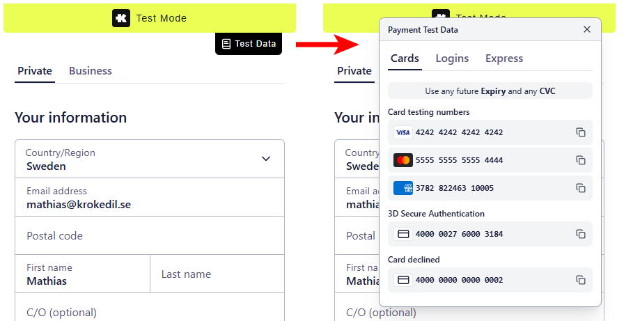 In the Kustom Checkout there is also a Test Data tab you can access Payment Test Data.